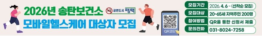 [충청뉴스큐] 평택시는 개인 맞춤형 건강관리 사업인 ‘2026년 보건소 모바일 헬스케어 사업’ 대상자 모집을 오는 6일부터 시작한다고 밝혔다.