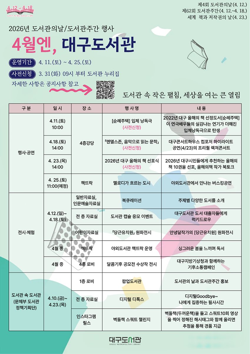 권현주 대구도서관장은 “4월 다채로운 도서관 행사를 통해 시민들이 일상에서 자연스럽게 독서를 즐기고 도서관이 시민 삶에 활력과 희망을 불어넣은 공간으로 자리매김하도록 노력하겠다”고 말했다.