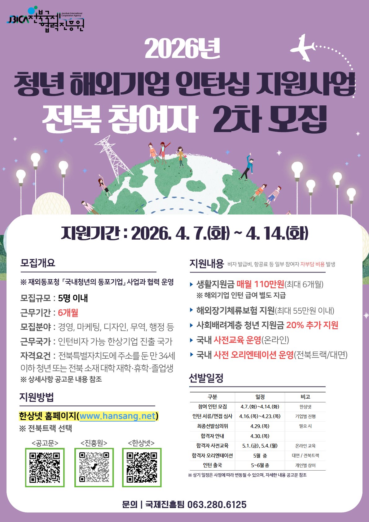 [충청뉴스큐] 전북국제협력진흥원은 도내 청년의 해외 진출과 글로벌 역량 강화를 위해 청년 해외기업 인턴십 지원사업 참여자를 오는 4월 7일부터 4월 14일까지 모집한다고 밝혔다.