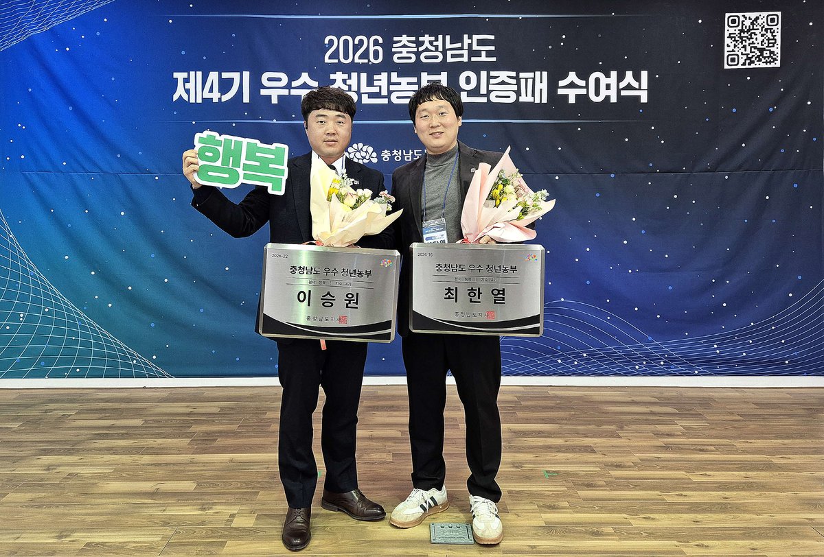 [충청뉴스큐] 서천군농업기술센터는 지난 2일 충청남도농업기술원에서 열린 ‘제4기 충남 농업 미래리더 인증식’에서 서천군 청년농업인 최한열 씨와 이승원 씨가 충청남도 우수청년농부 인증패를 수상했다고 밝혔다.