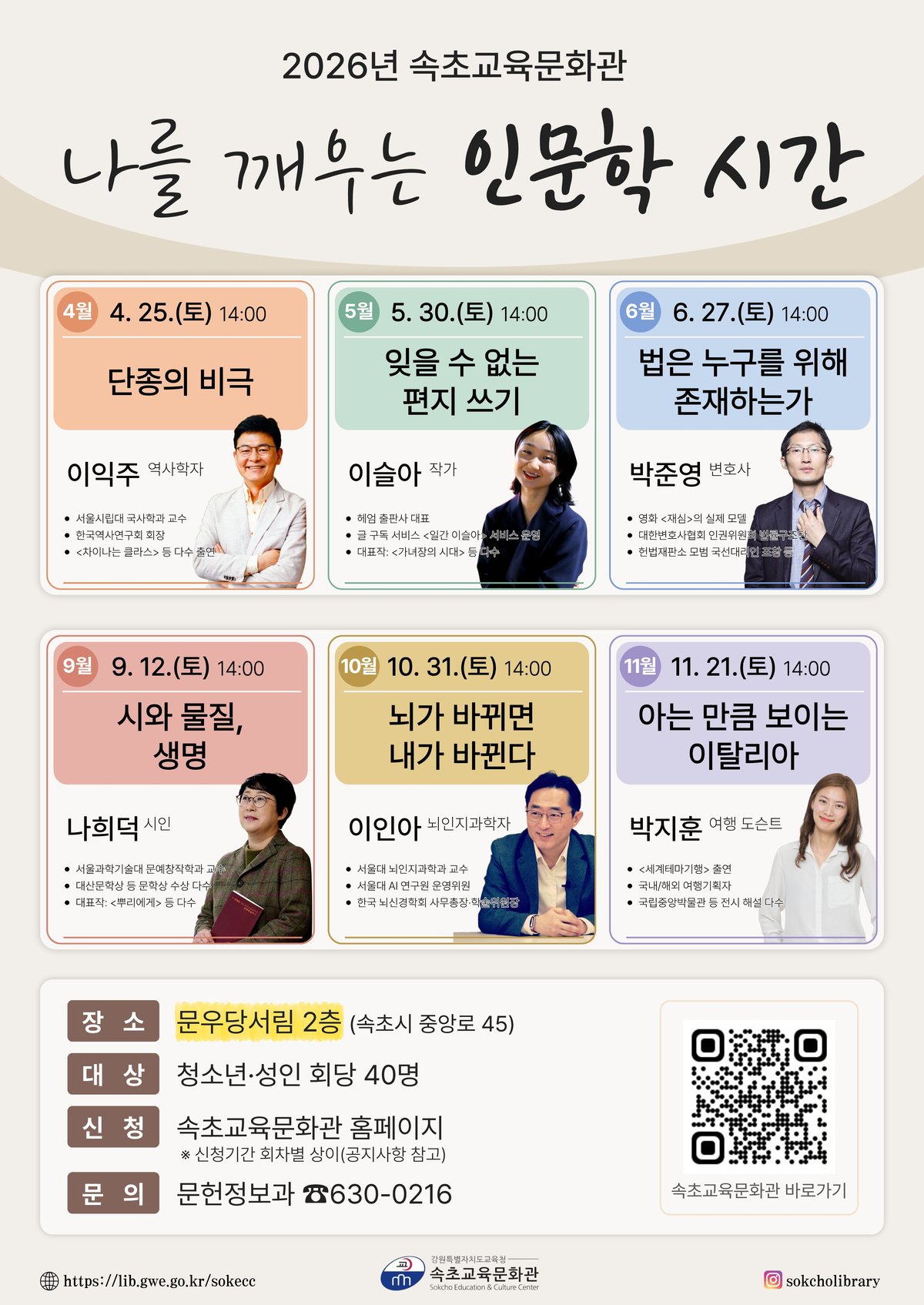 '나를 깨우는 인문학 시간'은 청소년과 지역 주민의 인문학적 소양 함양을 위한 명사 초청 강연 프로그램으로 속초교육문화관 개축 공사 중에도 인문학 강연을 이어가고 지역서점과의 상생 기반을 마련하기 위해 개최된다.