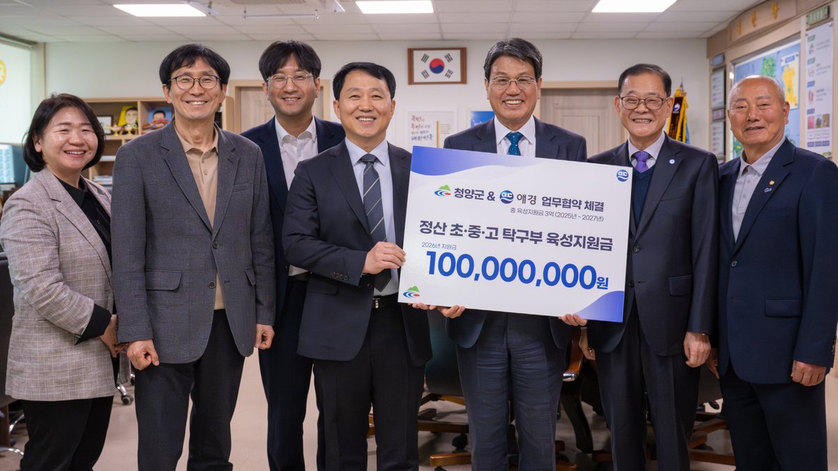 군은 지난 1일 애경산업(주)이 정산 초 중 고등학교 탁구부 육성을 위한 장학금 1억원을 기탁했다고 밝혔다.