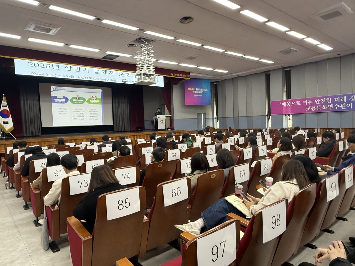 [충청뉴스큐] 경상남도는 법제 업무 능력 향상을 위해 4월 2일부터 3일까지 이틀간 경남교통문화연수원에서 도 및 시군 법제담당 공무원 75명을 대상으로‘2026년 상반기 법제처 순회 법제교육’을 실시했다.