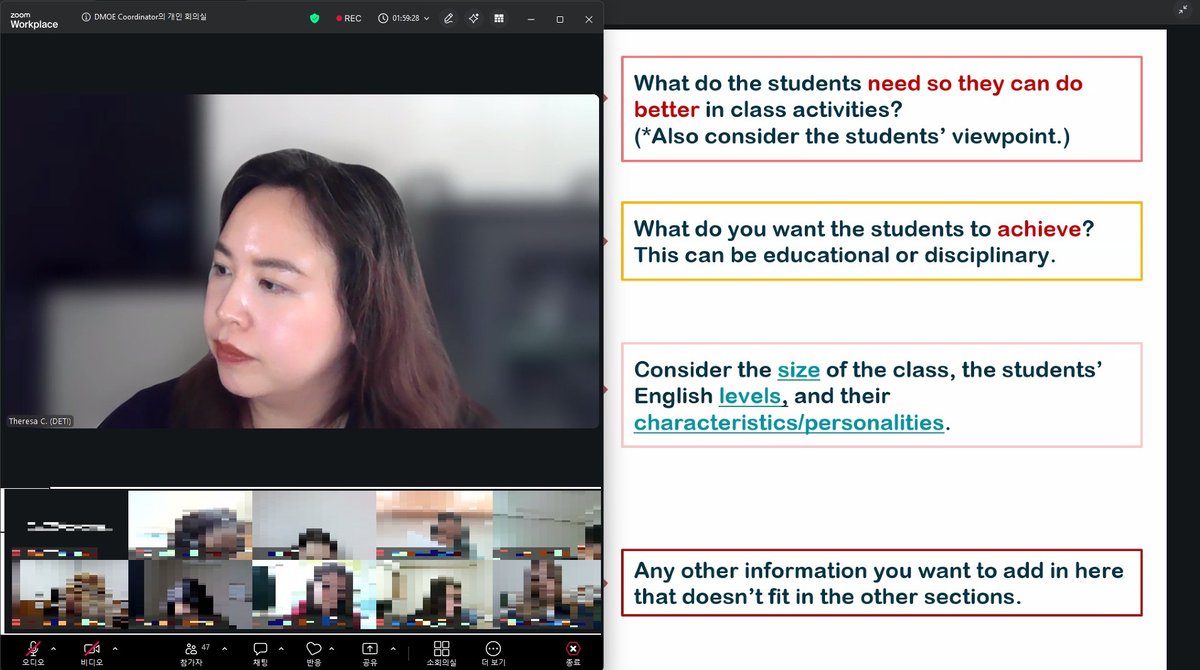 주요 과정은 협력수업의 구조 이해 및 협력교사와 효과적인 수업 운영, 다양한 수준을 반영한 수업 설계 및 맞춤형 교실 수업 방안, 한국 학생의 정서 심리 이해, 영어 캠프 운영, 수업 운영 사례 및 교실 상황별 시나리오, 한국 학교문화 이해 등으로 구성됐으며 총 12시간 동안 실시됐다.