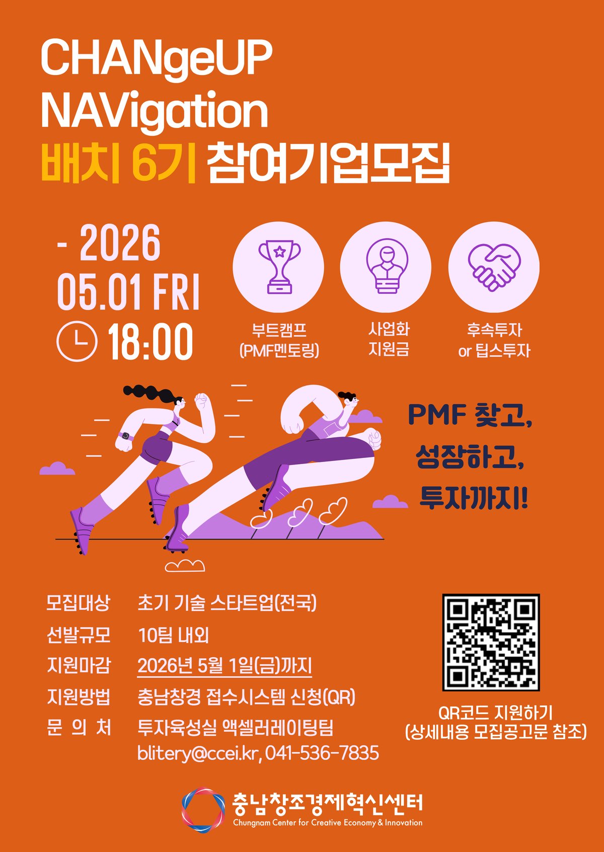 [충청뉴스큐] 충남창조경제혁신센터가 혁신 기술을 보유한 유망 스타트업의 비즈니스 스케일업을 지원하기 위해 '2026 CHANGeUP NAVIgation'배치 6기 프로그램의 참가 희망 기업을 모집한다고 밝혔다.