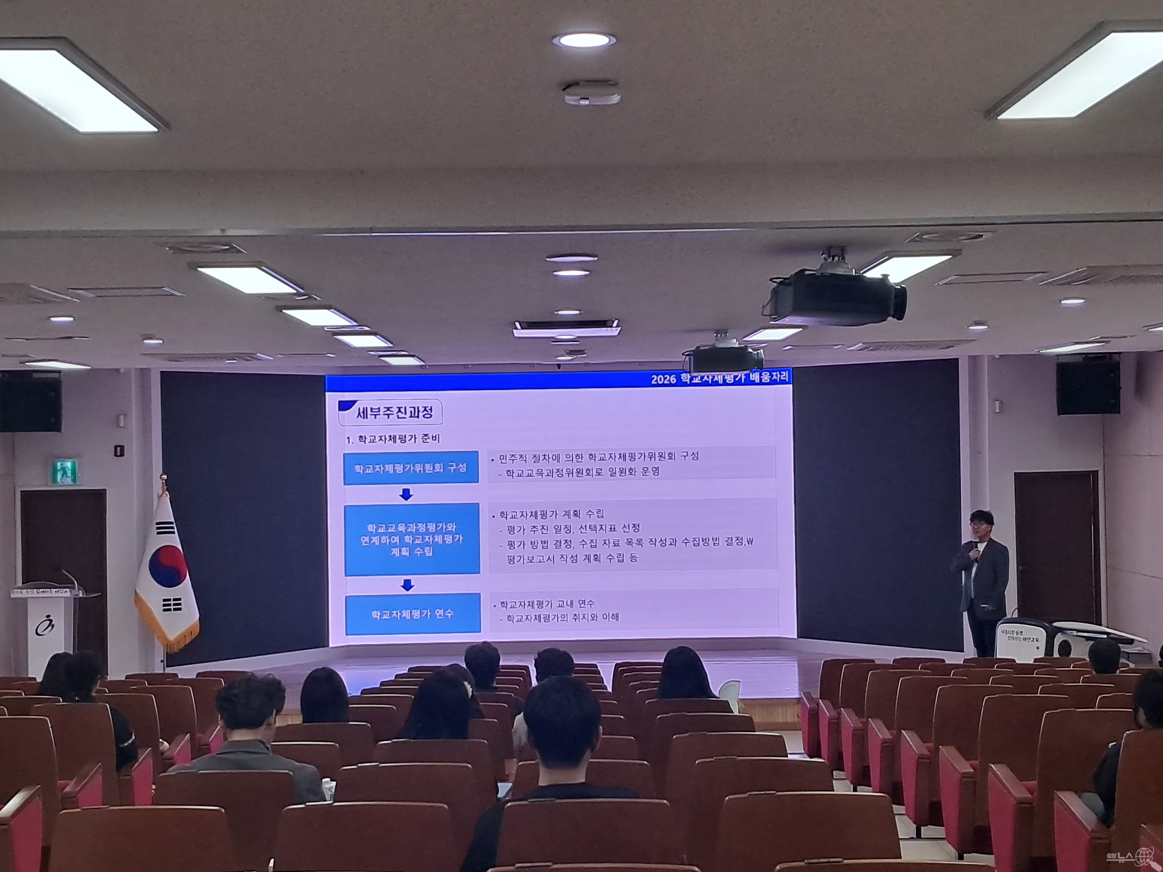 이날 강의를 맡은 남면중학교 김능우 교감은 충남 주요업무 계획과 참학력 교육과정, 2022 개정 교육과정을 반영한 자체평가 지표를 안내하고, 평가 결과의 정보공시와 교육과정 개선 자료로의 활용 방안을 설명했다. 특히 모든 교사의 참여를 바탕으로 학교 실정에 맞는 교육과정 편성과 운영의 중요성을 강조했다.