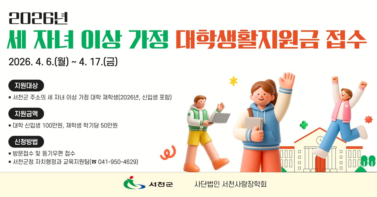 (사)서천사랑장학회는 ‘2026년도 상반기 세 자녀 이상 가정 대학생활지원금 지원계획’을 공고하고 오는 4월 6일부터 17일까지 2주간 지원 신청을 받는다.