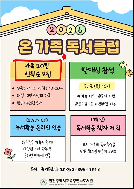 [충청뉴스큐] 인천광역시교육청연수도서관은 5월 9일부터 가족이 함께 책을 매개로 소통하며 성장하는 ‘온 가족 독서클럽’을 운영한다.