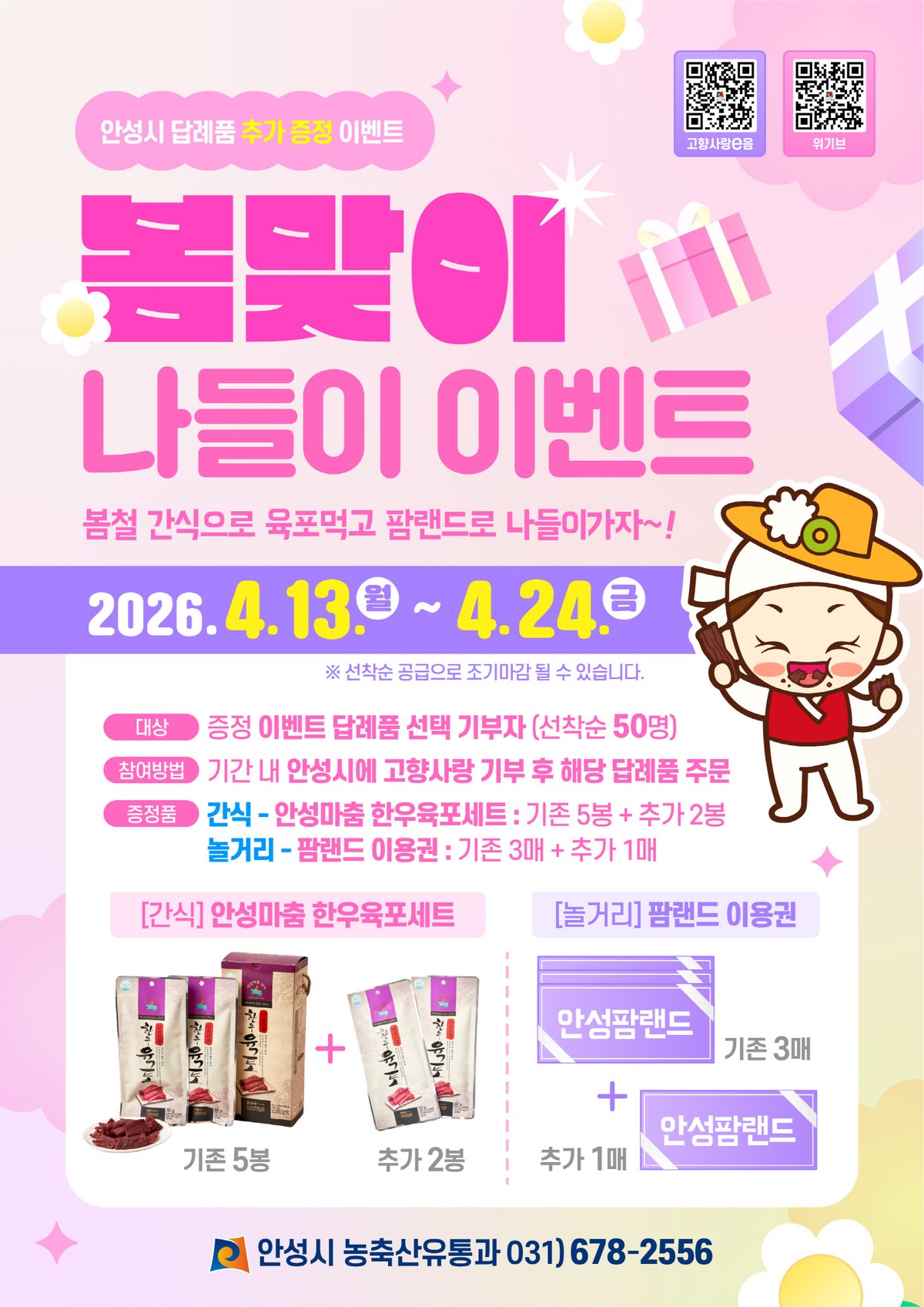 안성시 관계자는 “봄나들이와 어울리는 간식 및 체험형 답례품을 연계해 기부자의 만족도를 높이고자 이번 이벤트를 마련했다”며 “앞으로도 계절별 특색을 살린 다양한 이벤트를 통해 고향사랑기부 참여를 확대해 나가겠다”고 말했다.