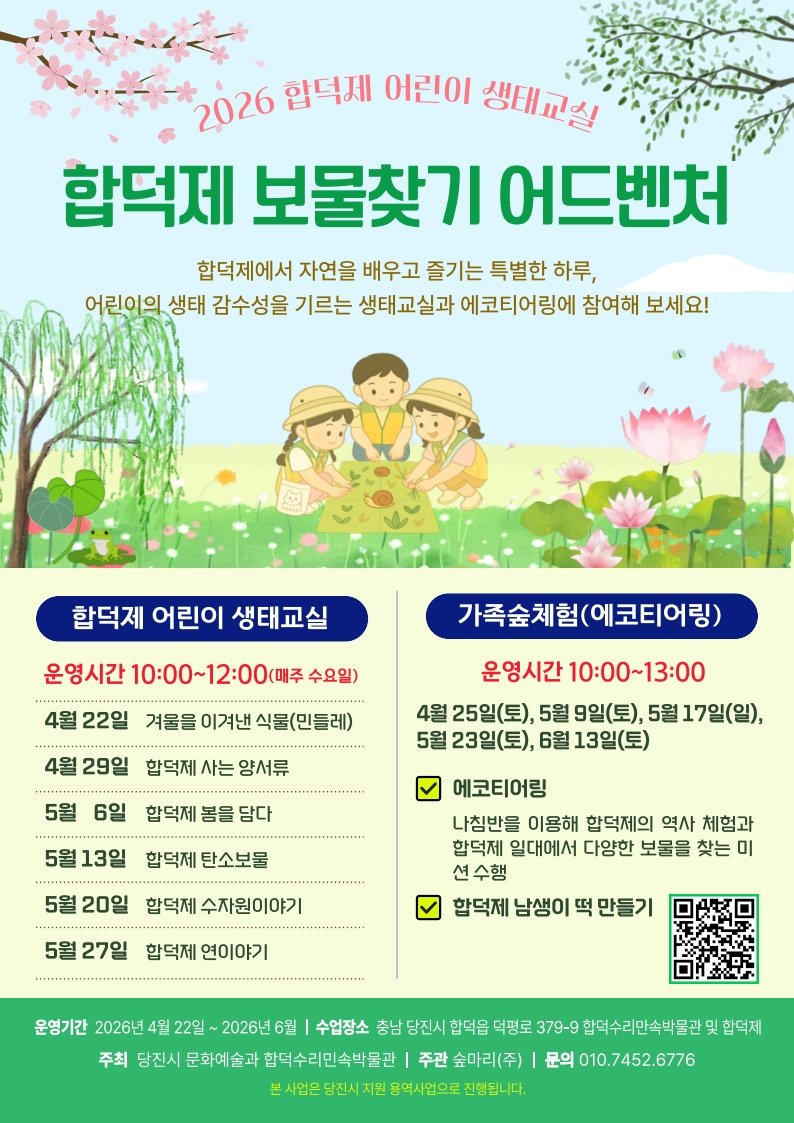 [충청뉴스큐] 당진시는 오는 6월까지 합덕제 야외 현장 및 합덕수리민속박물관에서 2026합덕제 어린이 생태교실 및 보물찾기 어드벤처 프로그램을 운영한다고 7일 밝혔다.