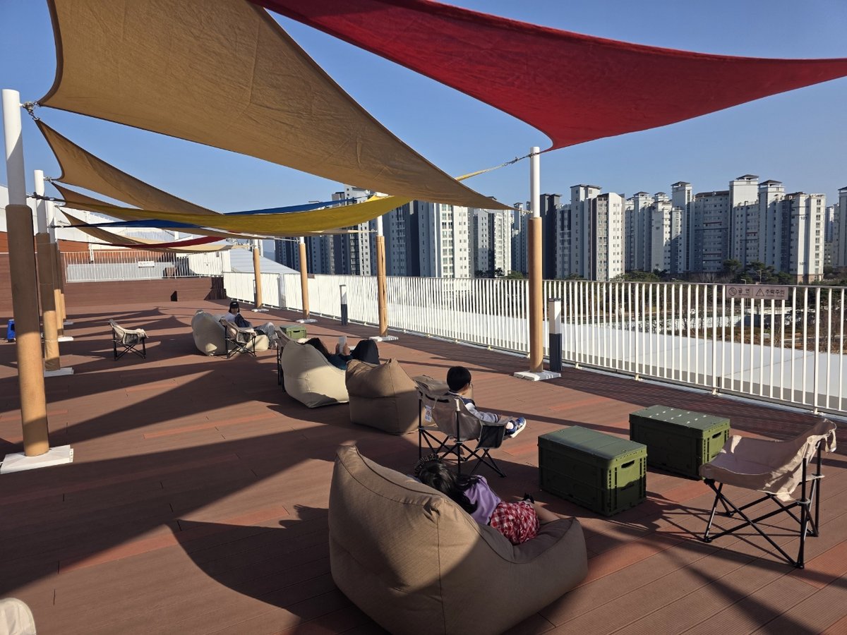 충남도서관은 탁 트인 야외 공간인 하늘정원에서 도서관 이용자들이 편안하게 휴식을 즐기면서 책을 읽고 여유롭게 시간을 보낼 수 있도록 캠핑 의자와 빈백, 캠핑 박스 등을 설치했다.