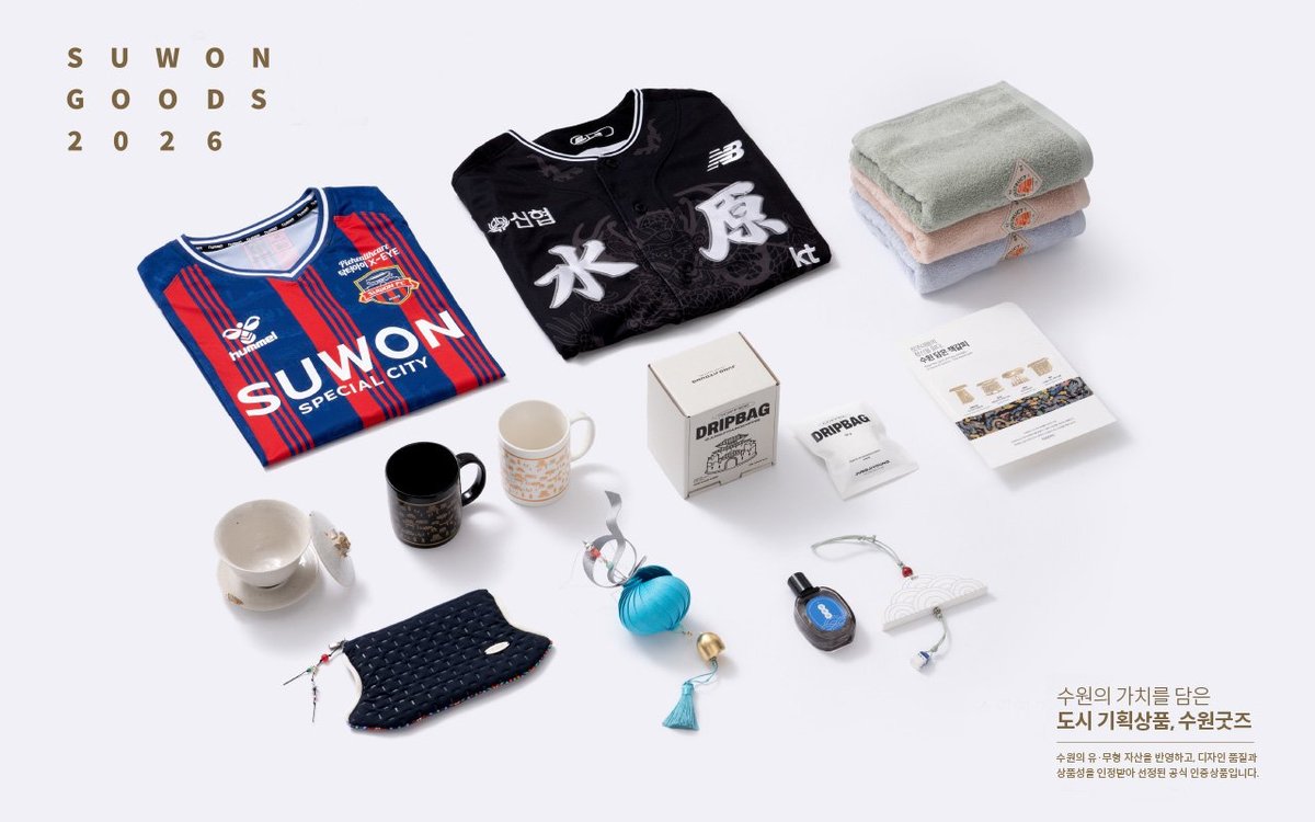 선정된 굿즈는 수원담은 책갈피 커피 드립백 효심깃든 복소라 풍경 수원화성을 담은 황금비율 아토얼 수건 점심다휴 수원화성을 담은 구름향기 모빌 우리동네, 수원산책 탐색 기와파우치 정조대왕 유니폼 2026시즌 홈 유니폼이다.