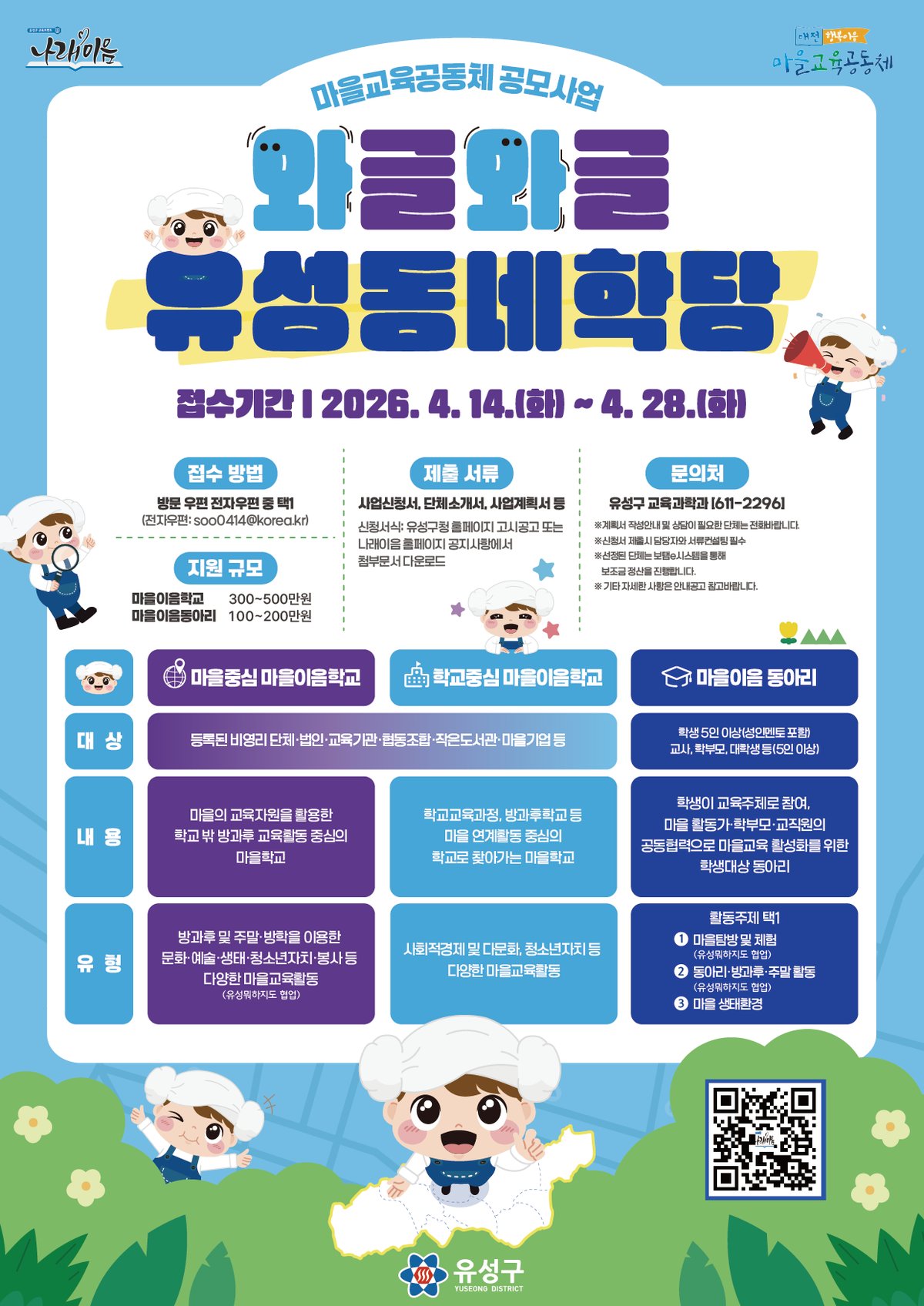 [충청뉴스큐] 대전 유성구는 '2026 마을교육공동체 와글와글 유성동네학당'공모사업을 추진한다.