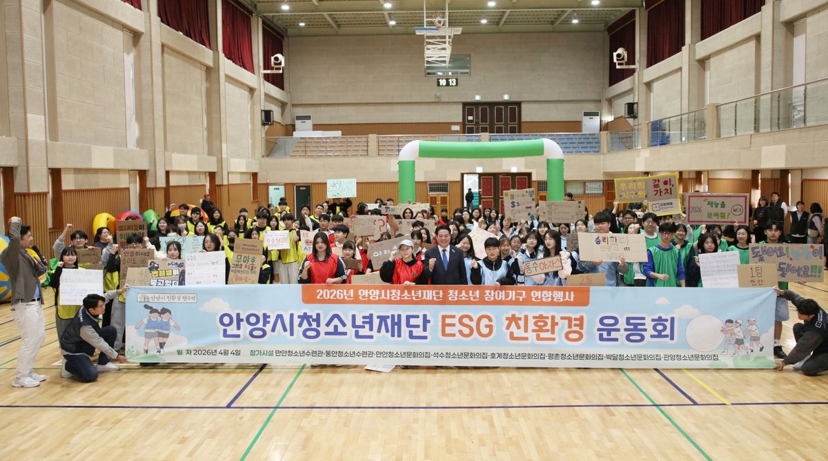 [충청뉴스큐] 안양시청소년재단,'ESG 친환경 운동회'개최 자치조직 청소년 170명 참여, 'ESG 청소년활동 선언문'선포 안양시청소년재단은 지난 4일 평촌과학기술고등학교 체육관에서 재단 소속 자치조직 청소년 170명이 참여한 가운데 'ESG 친환경 운동회'를 개최했다고 7일 밝혔다.
