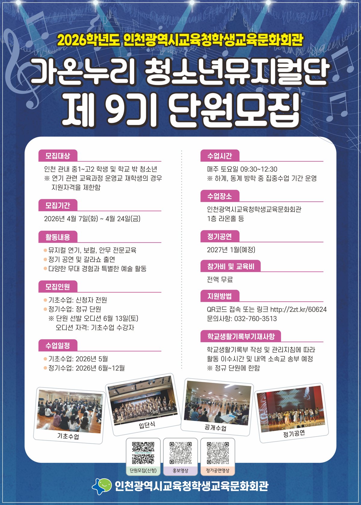 학생교육문화회관 관계자는 "뮤지컬, 연극, 보컬, 댄스 등 다방면에 끼와 재능을 갖춘 인천 관내 청소년들의 많은 관심과 지원을 바란다"며 "다양한 무대 경험과 내실 있는 전문 교육을 통해 학생들이 각자의 결에 맞게 진로를 탐색하고 성장할 수 있도록 아낌없이 지원하겠다"고 말했다.