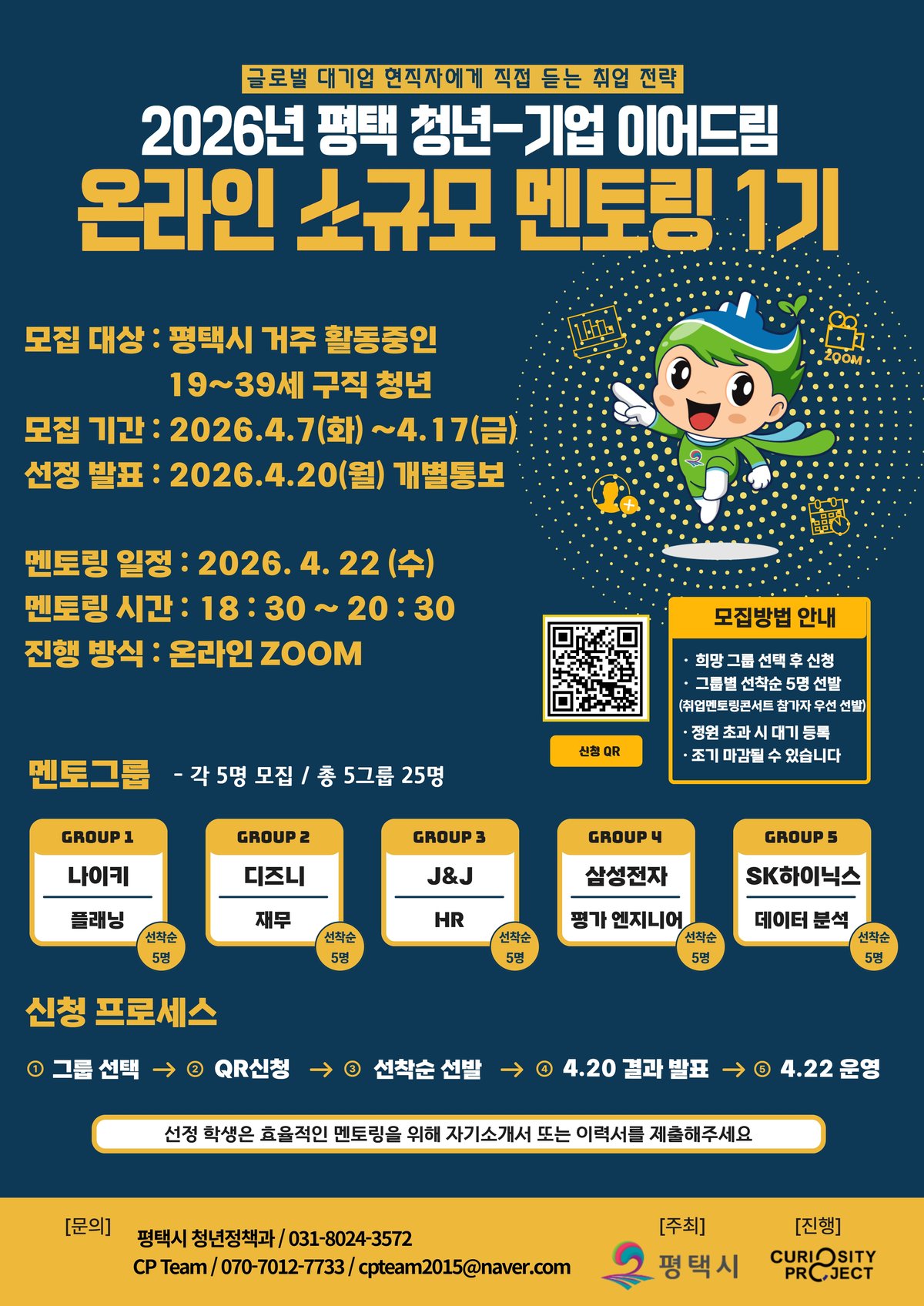 [충청뉴스큐] 평택시는 기업 현직자들의 취업 멘토링을 통해 실질적인 취업 준비를 지원하고 인적 네트워크 형성 기회를 제공하기 위한 평택 청년-기업 이어드림 ‘온라인 소규모 멘토링 1기’ 참여자를 오는 4월17일까지 모집한다.