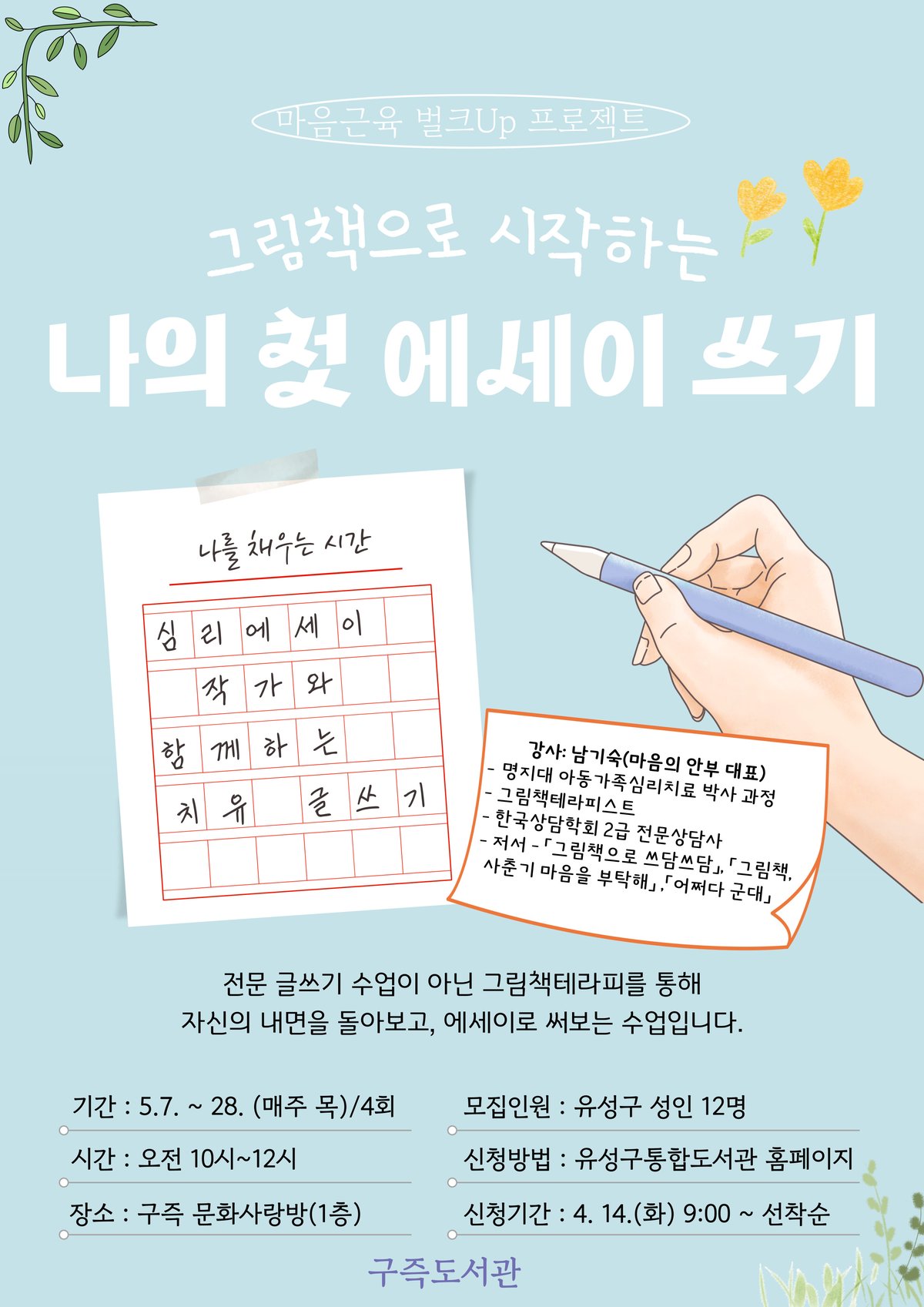 [충청뉴스큐] 대전 유성구는 5월 7일부터 28일까지 구즉도서관에서 성인을 대상으로 ‘마음근육 벌크UP 프로젝트 그림책으로 시작하는 나의 첫 에세이 쓰기’ 프로그램을 운영한다.