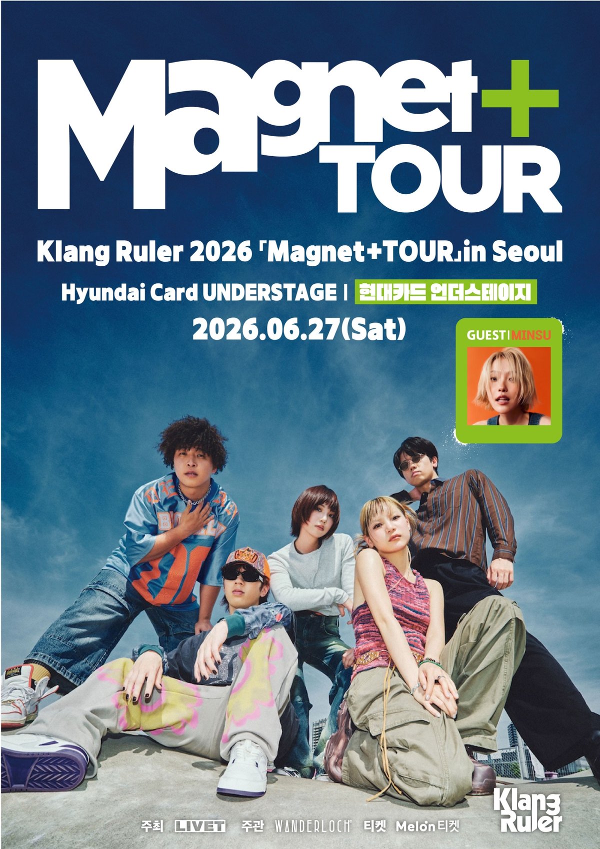 8일 라이브 엔터테인먼트 브랜드 리벳에 따르면 클랭 룰러는 오는 6월 27일 서울 현대카드 언더스테이지에서 첫 내한 공연 ‘Klang Ruler 2026 Magnet TOUR in Seoul'을 개최하고 국내 팬들과 만난다. 특히 이번 첫 내한 공연에는 독창적인 음색과 세련된 감성으로 사랑받는 싱어송라이터 민수가 게스트로 합류해 지원사격에 나선다. 개성 넘치는 활동으로 확고한 팬덤을 보유한 민수와 클랭 룰러의 만남은, 특별한 케미스트리를 예고하며 공연에 대한 기대감을 최고조로 끌어올리고 있다. 2015년 보컬이자 천재 트랙 메이커로 알려진 욘키를 중심으로 결성된 클랭 룰러는 향수를 자극하는 복고풍 사운드에 현대적인 감각을 입힌 ’뉴에이지 팝 뮤직‘을 지향한다. 특히 욘키는 글로벌 히트곡인 새로운 학교 리더즈의 ’オトナブルー'와 ‘Tokyo Calling'등을 프로듀싱하며 이미 탁월한 음악적 역량을 입증한 바 있다. 이들은 2021년 블랙 비스킷의 명곡을 재해석한 ’타이밍‘커버 곡으로 틱톡 주간 차트 5주 연속 1위, 스트리밍 20억 회 재생이라는 대기록을 세우며 MZ세대의 아이콘으로 떠올랐다. 이후 애니메이션 ’트릴리온 게임‘의 엔딩 테마 ’Unbelievable'과 정식 발매 전부터 SNS 1000만 뷰를 기록한 ‘Teenage Blue'등을 잇달아 히트시키며 대세 밴드로서의 입지를 굳혔다.