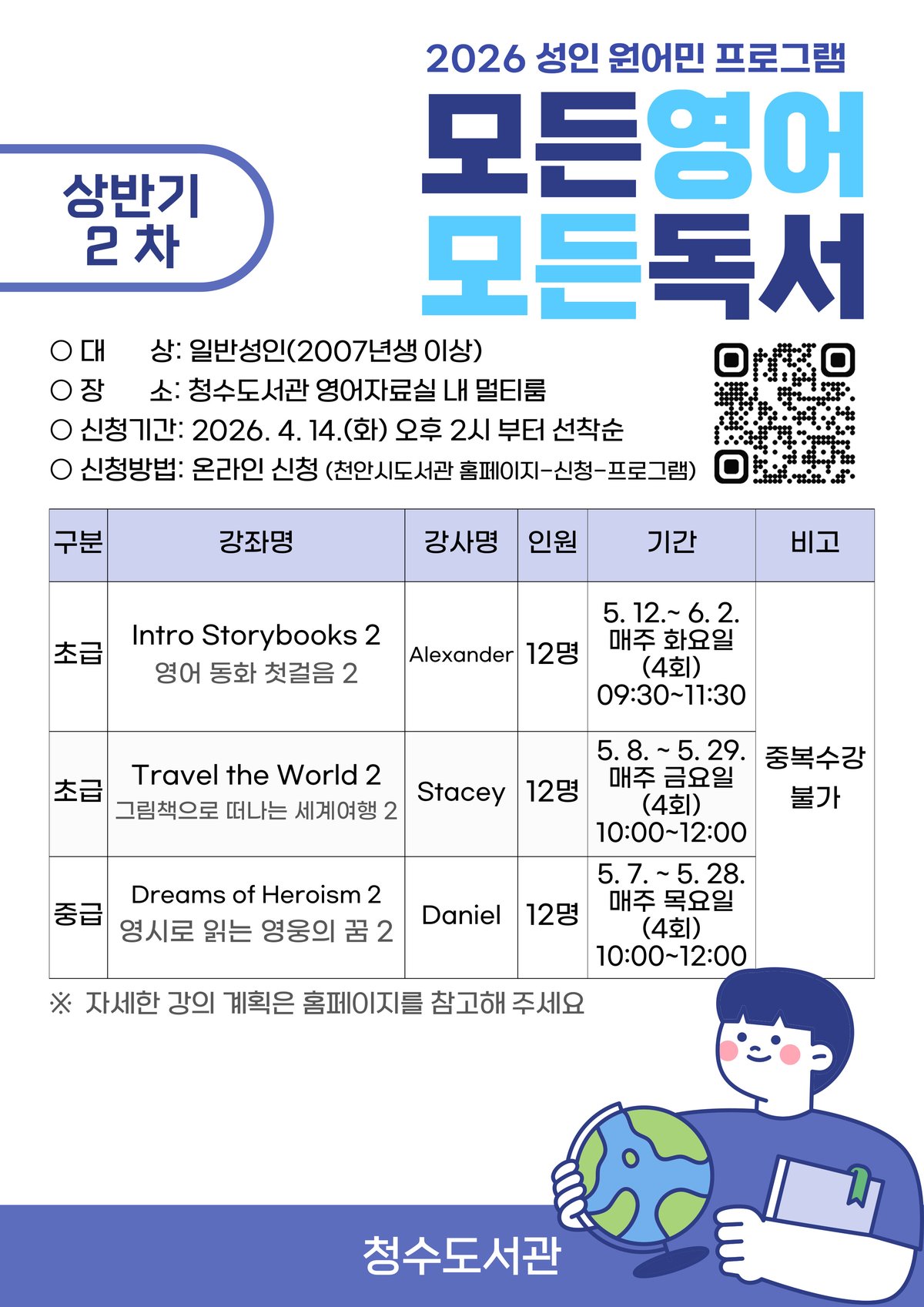 [충청뉴스큐] 천안시 청수도서관은 다음달부터 원어민 영어 독서프로그램 ‘모든 영어 모든 독서’ 수강생을 모집한다고 9일 밝혔다.