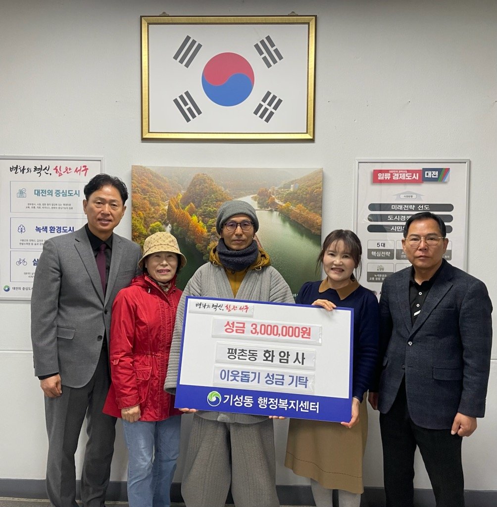 [충청뉴스큐] 대전 서구 기성동 행정복지센터는 9일 서구 평촌동 소재 화암사로부터 이웃돕기 성금을 전달받았다.