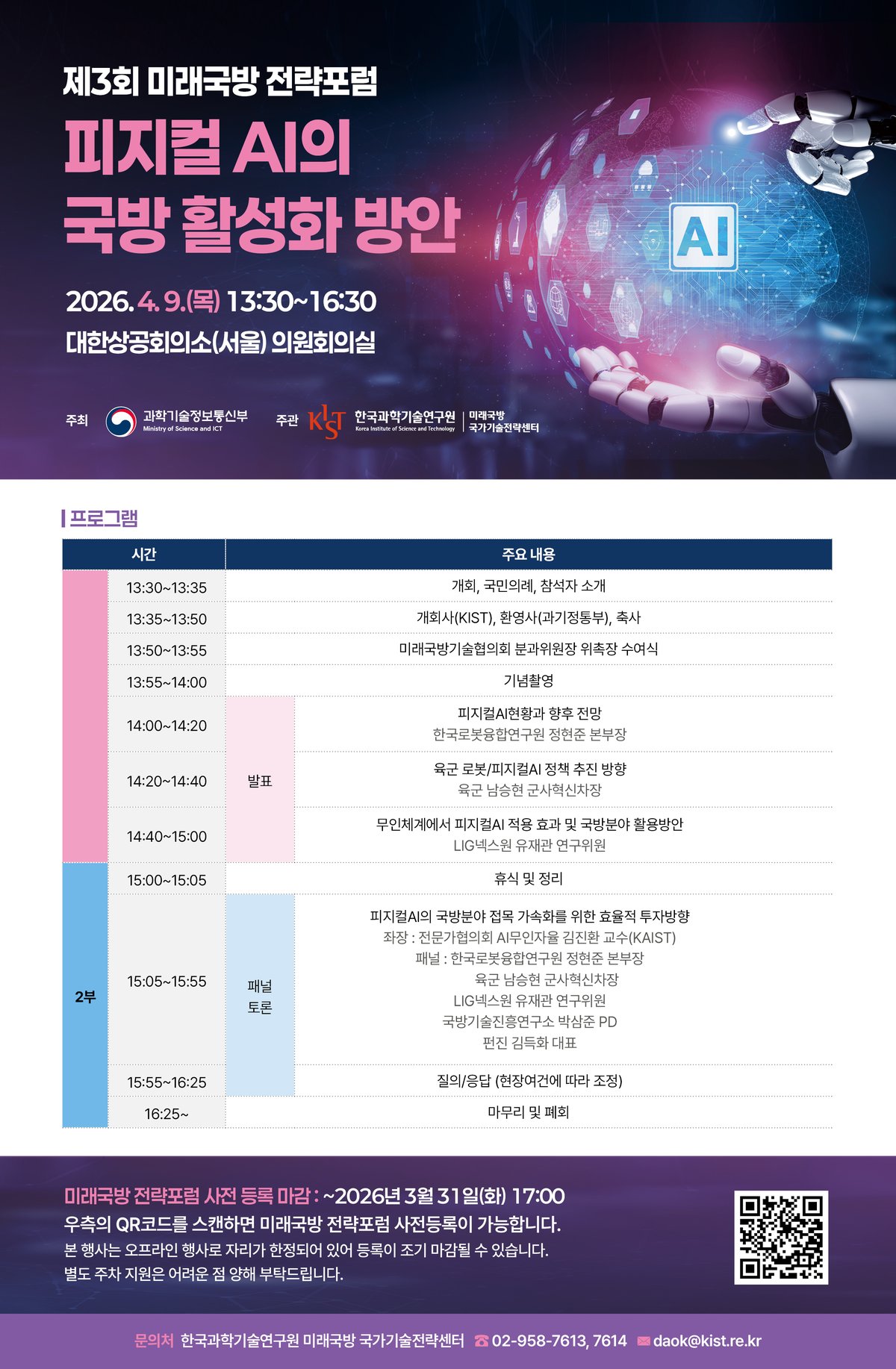 [충청뉴스큐] 과학기술정보통신부는 한국과학기술연구원과 함께 4월 9일 대한상공회의소에서 제3회 미래 국방 전략 토론회을 개최했다고 밝혔다.