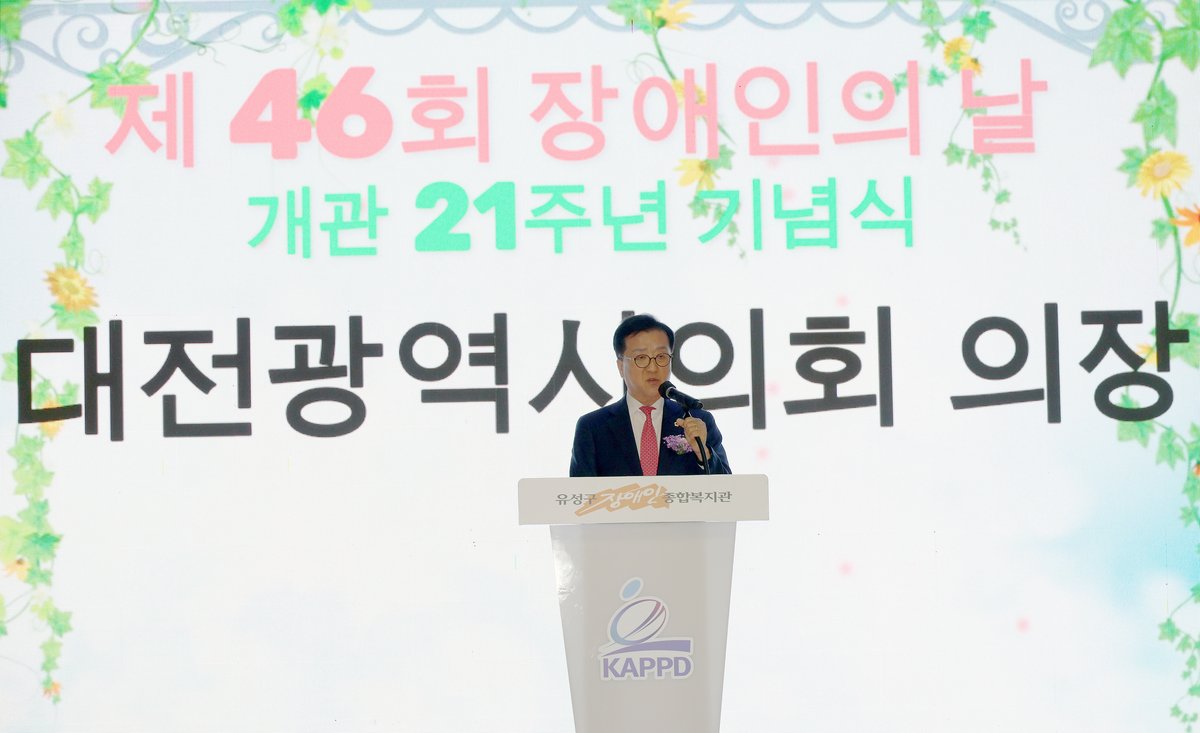 조원휘 의장은 축사를 통해 “표창을 받으신 분들의 미소에서 대전의 희망을 보았다”며 “대전시민 100명 중 5명, 유성구에만 만 이천여명의 구민이 장애와 함께 살아가고 계신다”고 말했다.