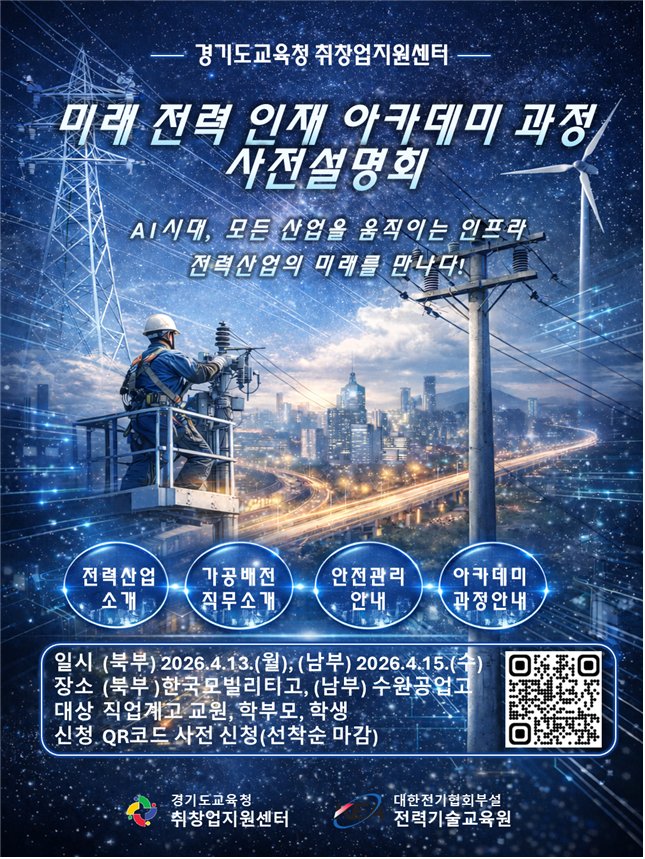 [충청뉴스큐] 경기도교육청이 오는 13일과 15일 양일간 도내 직업계고 학생의 전력산업 분야 진로 탐색과 취업 역량 강화를 위한 ‘미래 전력 인재 아카데미 과정 사전설명회’를 개최한다.