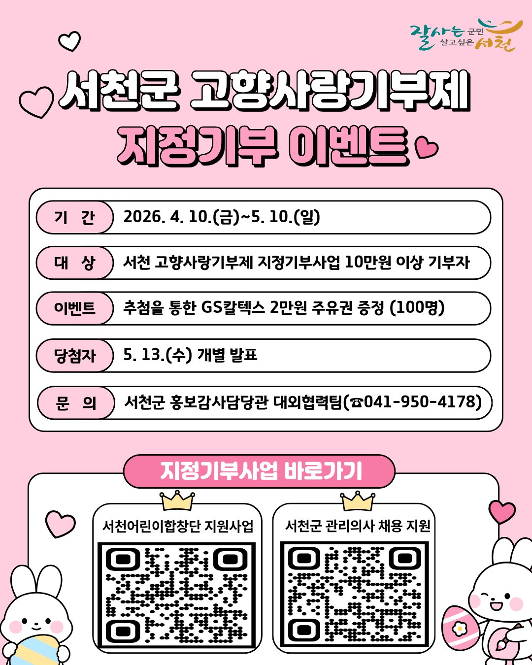 [충청뉴스큐] 서천군은 고향사랑기부제 지정기부사업 활성화와 기부 참여 확산을 위해 오는 4월 10일부터 5월 10일까지 지정기부사업 기부 이벤트를 추진한다.