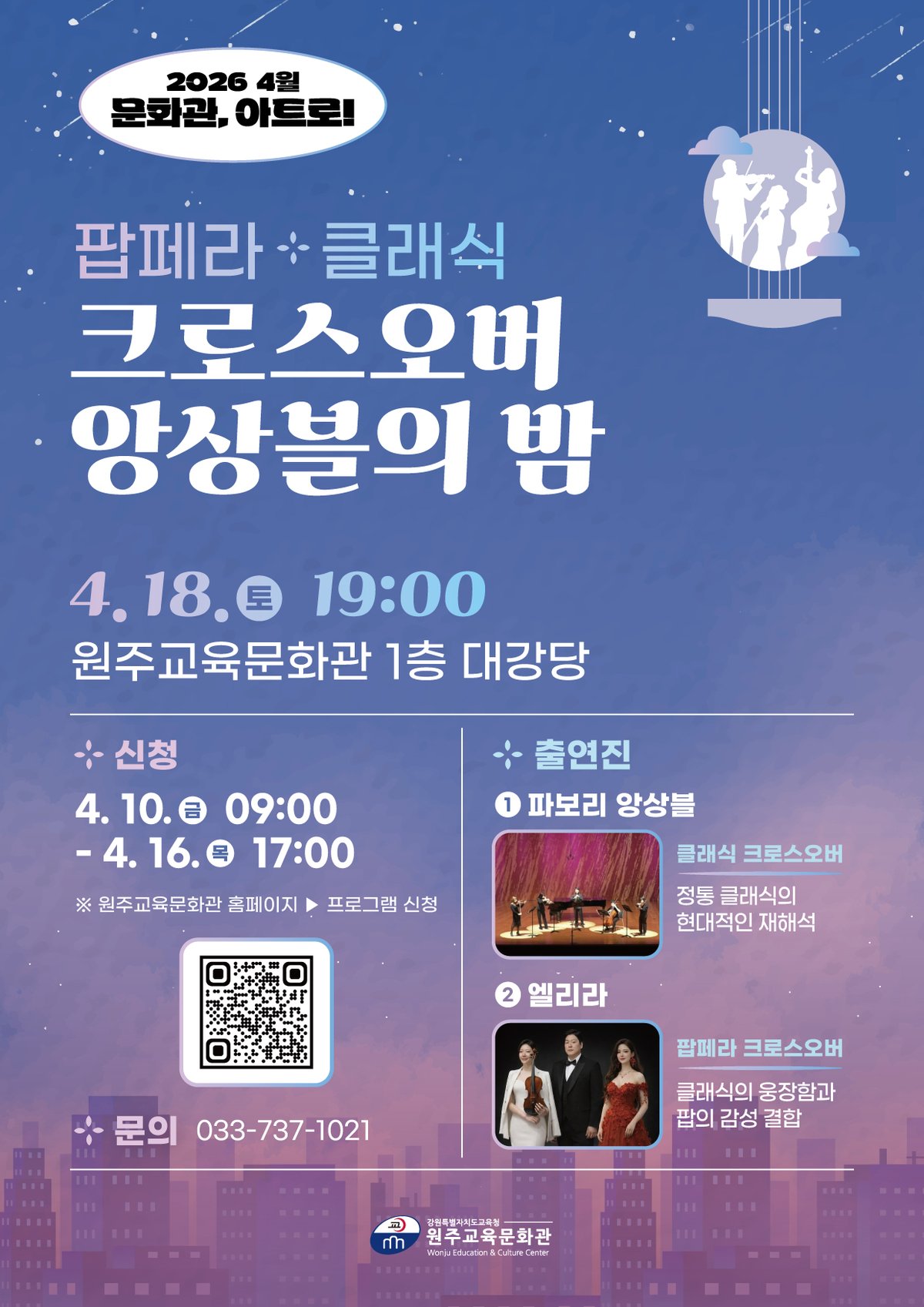[충청뉴스큐] 원주교육문화관은 관내 학생, 학부모, 지역 주민의 문화 향유 기회 확대를 위해 2026년 문화예술공연 ‘문화관, 아트로’ 공연을 연중 운영한다.