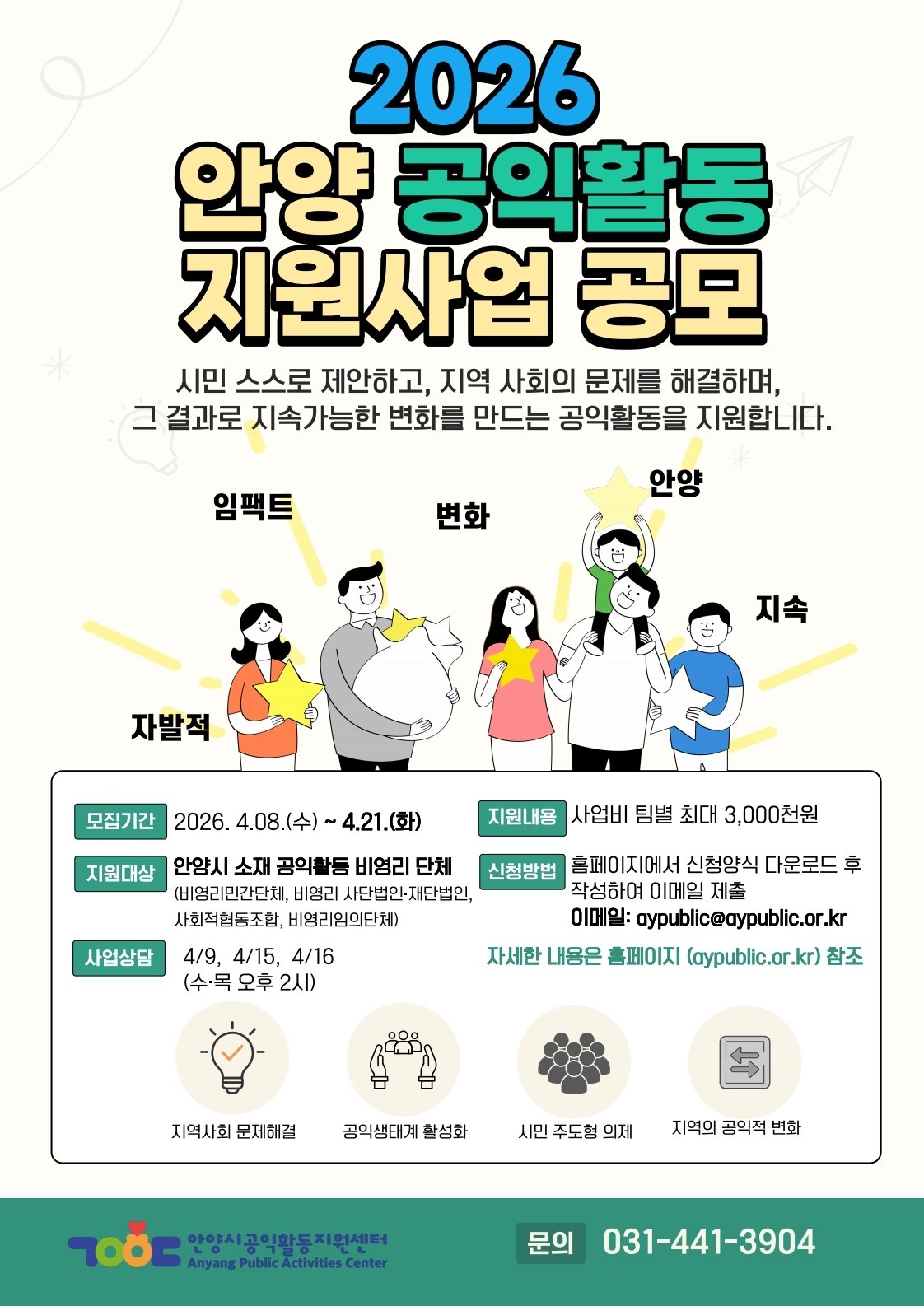 천 희 센터장은 “시민들이 일상에서 느끼는 고민과 제안들이 안양의 새로운 변화를 만드는 소중한 동력이 될 것”이라며 “시민 주도의 활기찬 공익 생태계를 함께 만들어갈 단체와 모임들의 많은 관심과 참여를 기대한다”고 전했다.
