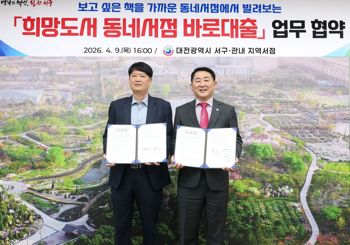 [충청뉴스큐] 대전 서구는 9일 구청 갑천누리실에서 지역 서점 2개소와‘희망도서 동네서점 바로대출’서비스 업무 협약을 체결했다.
