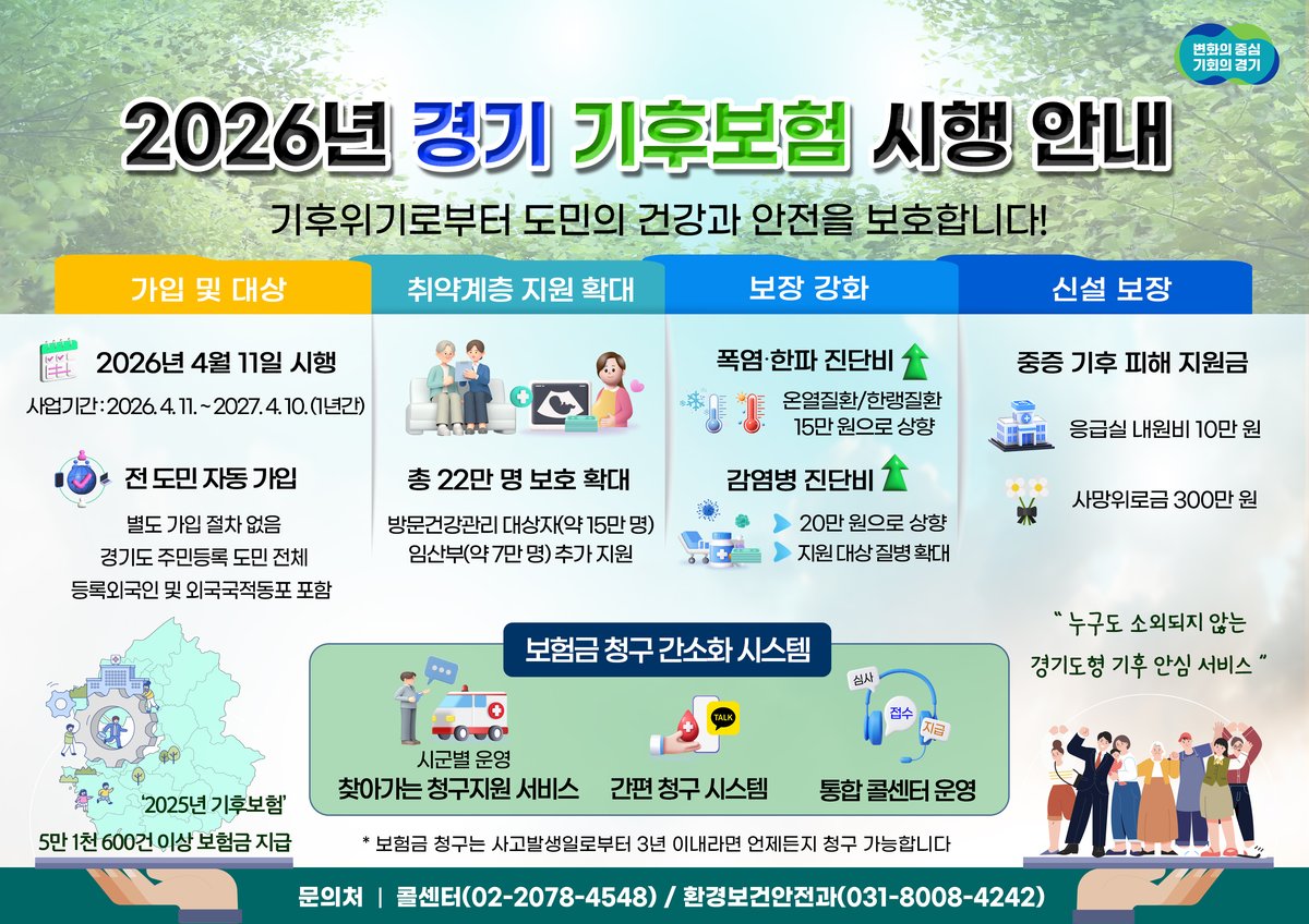 경기 기후보험은 경기도에 주민등록을 둔 도민이라면 등록외국인과 외국국적동포를 포함해 누구나 별도의 절차 없이 자동으로 가입된다.나아가 보험금을 몰라서 못 받거나 청구 과정이 번거로워 포기하는 도민이 없도록 청구 시스템을 대대적으로 개편했다.시군별로 찾아가는 기후보험 청구지원 서비스를 운영하고 모바일 메신저를 활용한 간편 청구 방식을 도입하며전담 통합 콜센터를 구축해 접수부터 지급까지의 전 과정을 한 번에 처리할 계획이다.