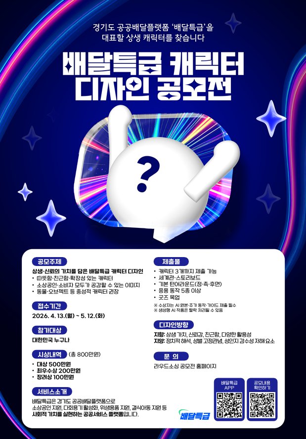 [충청뉴스큐] 경기도주식회사가 오는5월12일까지 공공배달앱 배달특급의 캐릭터 디자인을 공개 모집한다.