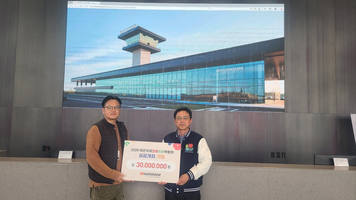 [충청뉴스큐] 태안국제원예치유박람회조직위는 10일 태안군 남면 한국타이어 사옥에서 조직위와 한국타이어 관계자가 참석한 가운데 박람회 성공 개최를 위한 후원금 전달식을 열고 한국타이어로부터 3천만원의 후원금을 전달받았다고 밝혔다.
