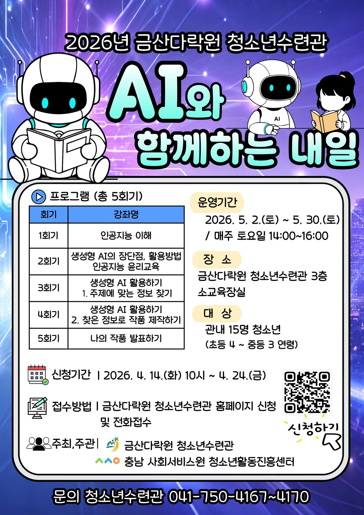 [충청뉴스큐] 금산군청소년수련관은 인공지능 체험 교육 프로그램 ‘AI와 함께하는 내일’ 참가자 15명을 4월 14일부터 24일까지 선착순 모집한다.