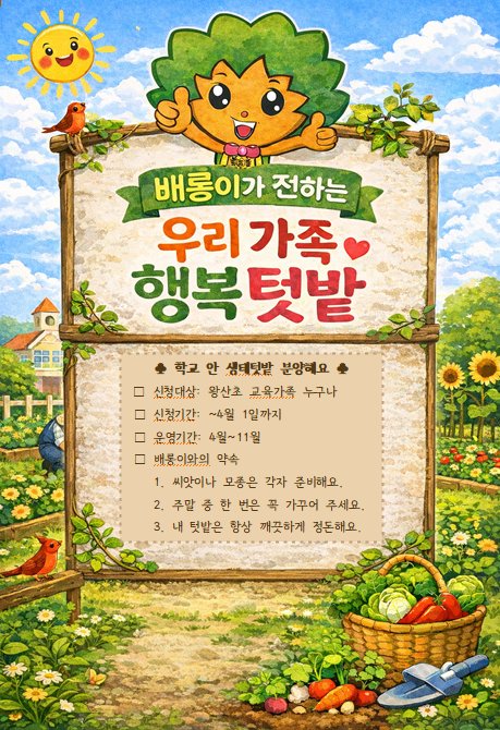한편 왕산초등학교는 이번 행복 텃밭 분양을 시작으로 주 1회 이상 가족 단위 방문 재배, 가을철 수확 체험, 텃밭 요리 교실 등 다채로운 가족 참여형 생태 교육 프로그램을 지속적으로 운영해 나갈 계획이다.