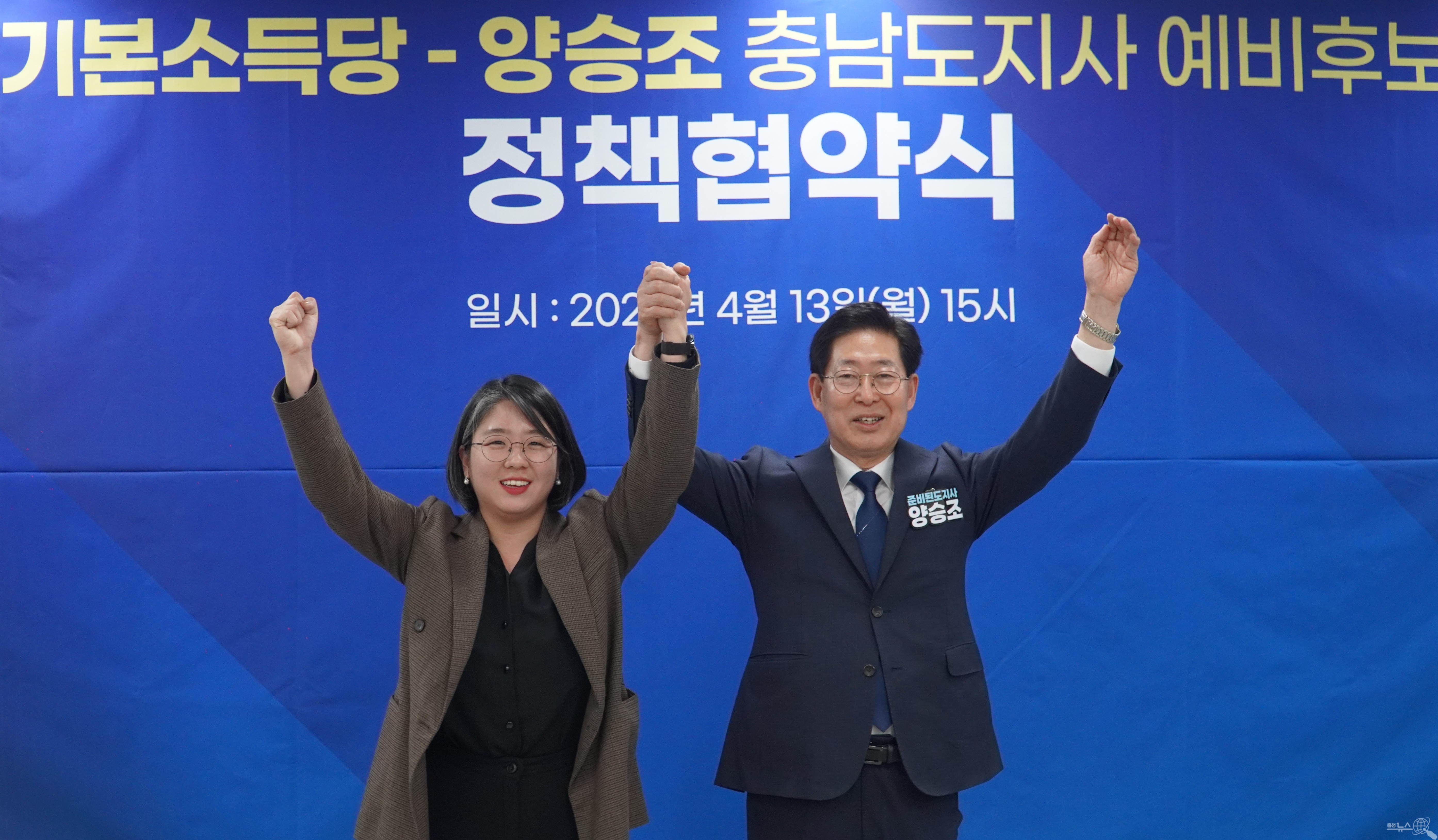 더불어민주당 충남도지사 경선 결선 투표가 시작된 13일(월), 천안시청 브리핑룸에서 ‘기본소득 정치의 아이콘’ 용혜인 기본소득당 대표와 양승조 예비후보가 충남의 미래를 바꿀 “전략적 정책 연대”]를 선언했다.