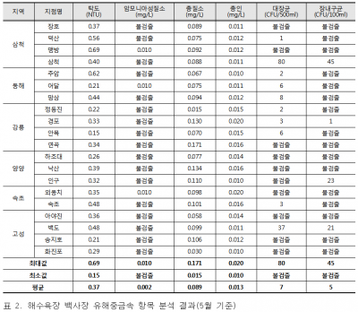 수질조사 결과 모든 해수욕장에서 대장균군은 0~80 CFU/100mL, 장구균은 0~45 CFU/100mL로 해수욕장 수질기준에 적합했다.