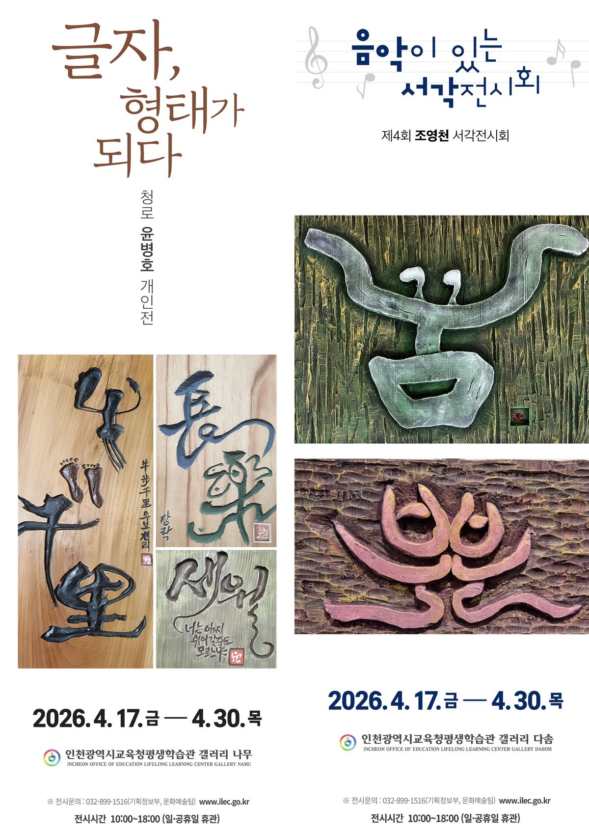 [충청뉴스큐] 인천광역시교육청평생학습관은 4월 17일부터 30일까지 갤러리 나무 와 다솜 에서 서각예술의 정수를 느낄 수 있는 ‘글자, 형태가 되다’ 와 ‘음악이 있는 서각’ 전시회를 각각 개최한다.
