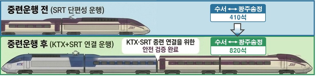 호남선은 토·일요일에 수서와 광주송정을 오가는 일부 열차에 적용된다. 기존에한 대의 열차로 운행하던 SRT에 KTX를 추가로 연결해 운행해, 좌석공급이 늘고 이용 편의가 개선될 것으로 기대된다.
