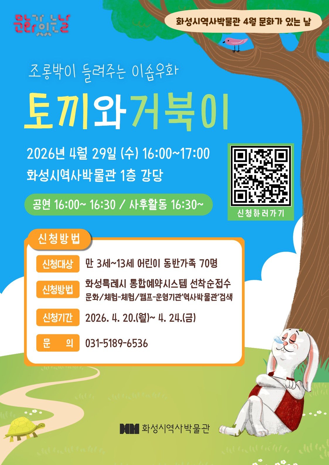 공연은 4월 29일 오후 4시부터 화성특례시 역사박물관 1층 강당 및 세미나실에서 60분간 진행되며 만 3세부터 13세까지 참여할 수 있다.