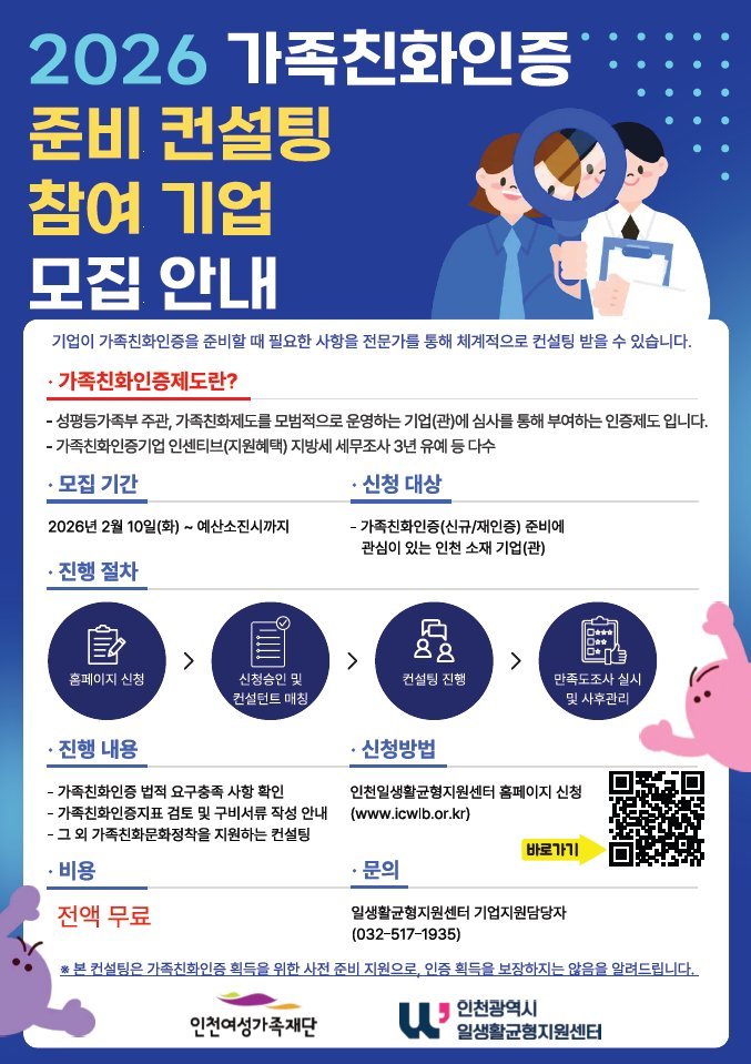 가족친화인증 관련 컨설팅 및 직장교육 신청과 혜택 등 자세한 사항은 ‘인천광역시 일·생활균형지원센터’누리집을 h 통해 확인할 수 있으며 컨설팅과 교육은 예산 소진 시까지 선착순으로 접수한다.