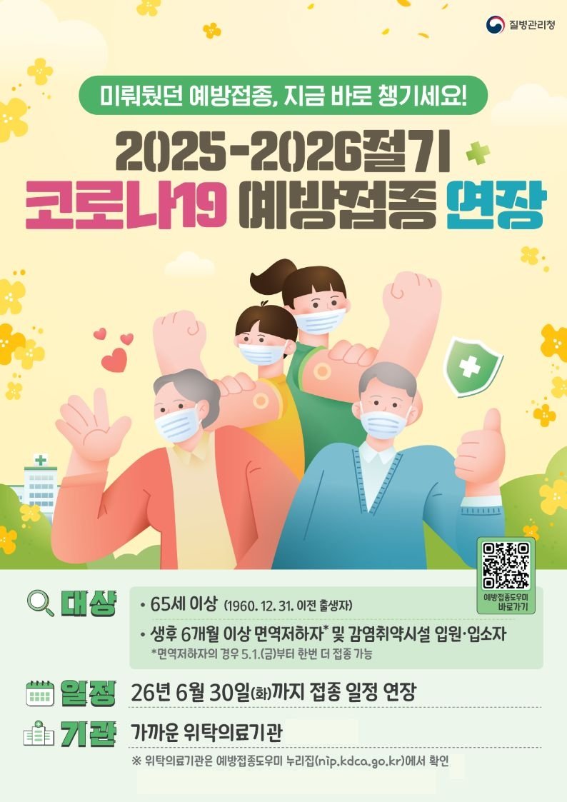 [충청뉴스큐] 고위험군은 꼭 챙겨주세요 평택시는 코로나19 여름철 유행에 대비해, 기존 4월 30일 종료 예정이던 ‘25-'26절기 코로나19 예방접종 사업 기간을 오는 6월 30일까지 연장 운영한다고 밝혔다. 이번 연장은 아직 예방접종을 받지 않은 고위험군의 건강 보호를 위해 시행되며 접종 대상은’ 25-'26절기 코로나19 백신 미접종 고위험군이다.
