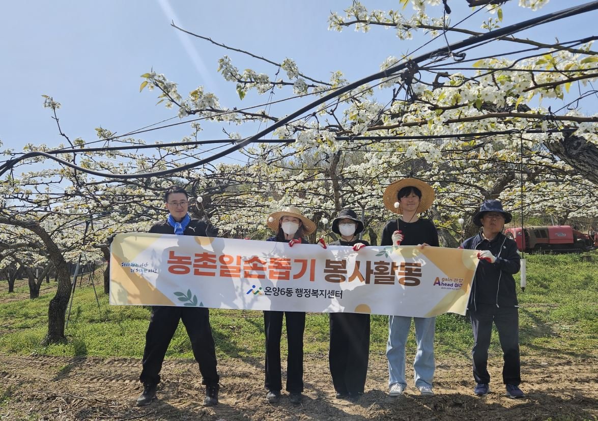 [충청뉴스큐] 아산시 온양6동이 본격적인 농번기를 맞아 일손 부족으로 어려움을 겪고 있는 관내 배 재배 농가를 찾아 농촌 일손 돕기 봉사활동을 펼쳤다.