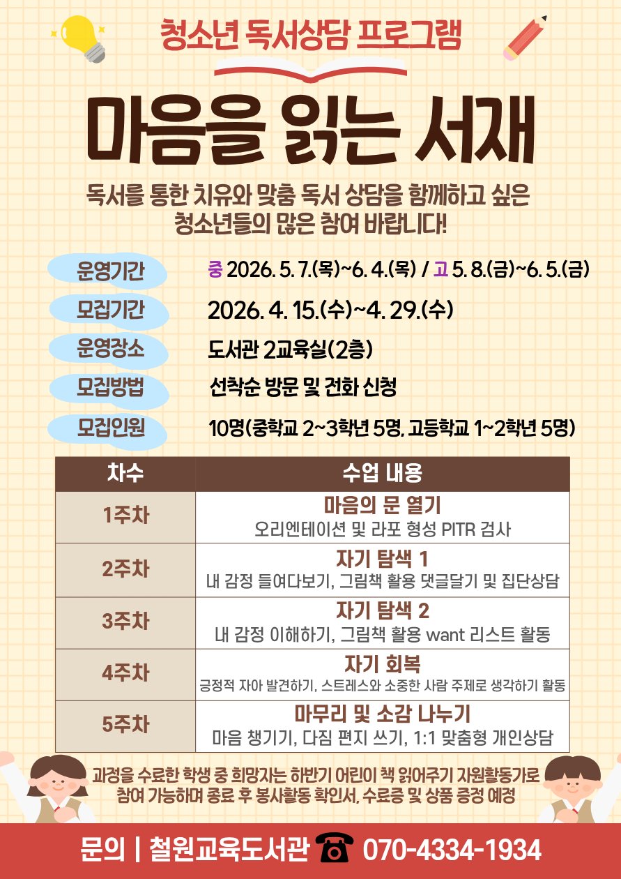 [충청뉴스큐] 철원교육도서관은 5월 7일부터 6월 5일까지 2교육실에서 중·고생 10명을 대상으로 청소년 독서 상담·교육봉사 ‘나1너2'프로그램을 운영한다’나1너2'은 청소년들이 독서 상담을 통해 키운 역량을 바탕으로 지역사회 어린이들에게 재능을 기부하는 프로그램으로 단순한 일회성 교육에서 벗어나 도서관에서 배운 지식을 현장에서 실천하는 성장형 사회 환원을 도모하기 위해 마련됐다.