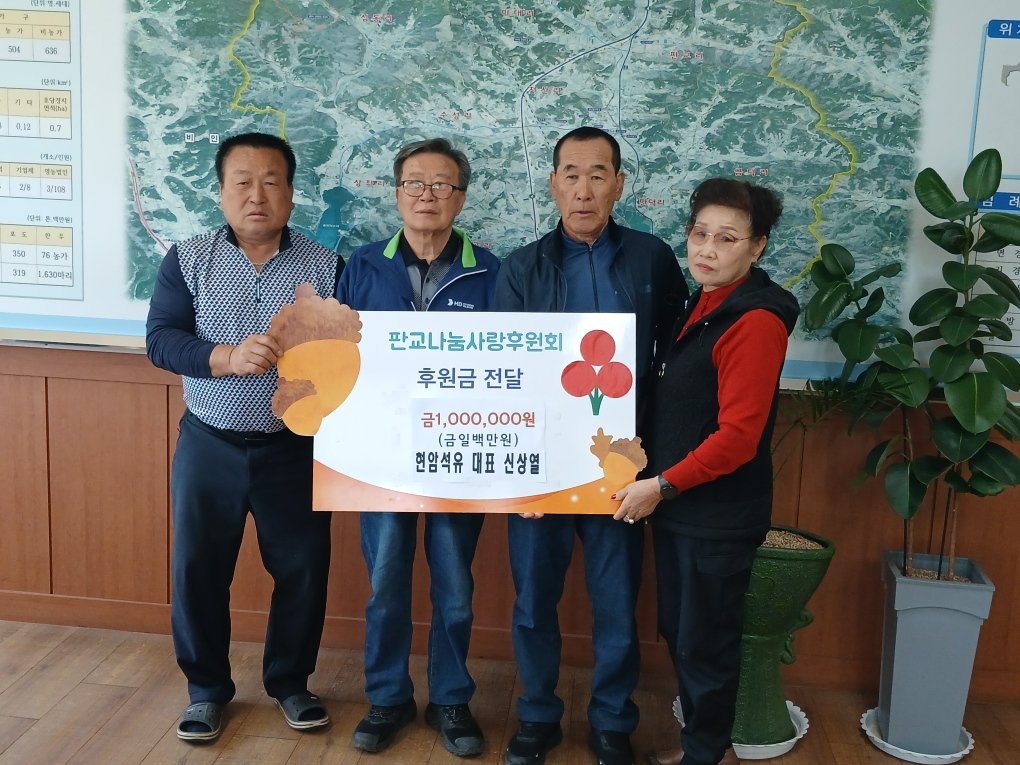 [충청뉴스큐] 현암석유는 지난 15일 판교지역 취약계층 지원을 위해 판교나눔사랑후원회에 후원금 100만원을 전달했다.