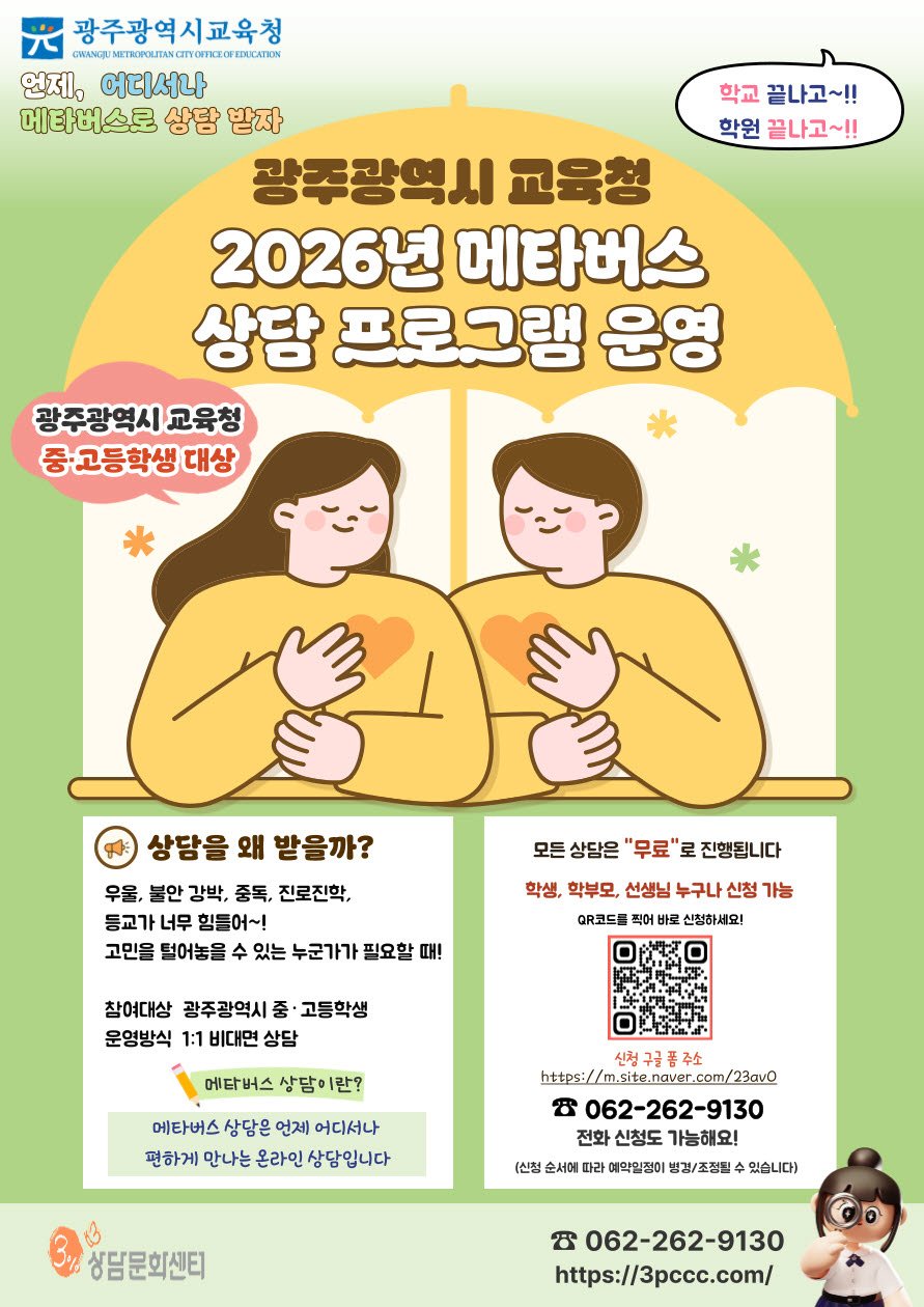 [충청뉴스큐] 광주시교육청은 학생들의 심리·정서를 더욱 촘촘하게 살피기 위해 ‘2026년 메타버스 상담 프로그램’을 개편 운영한다.
