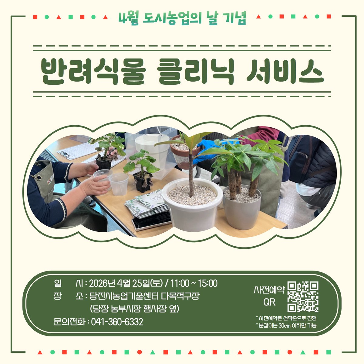 [충청뉴스큐] 당진시는 4월 도시농업의 날을 기념하고 도시농업을 널리 알리기 위해 오는 25일 오전 11시부터 오후 3시까지 농업기술센터 다목적구장에서 ‘반려식물 클리닉 서비스’를 운영한다고 17일 밝혔다.