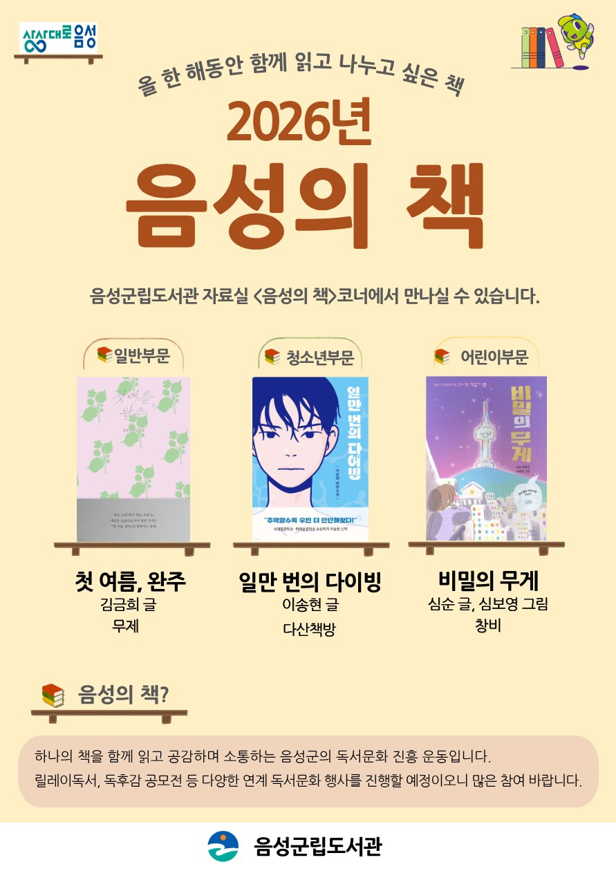 안은숙 문화복지국장은 “선정 과정에 군민이 직접 참여한 ‘음성의 책’ 이 지역사회 곳곳에서 소통과 공감의 매개가 되길 기대한다”며 “앞으로도 누구나 쉽게 책을 만나는 환경 조성과 독서 문화 확산을 위한 다양한 사업을 적극 추진하겠다”고 말했다.