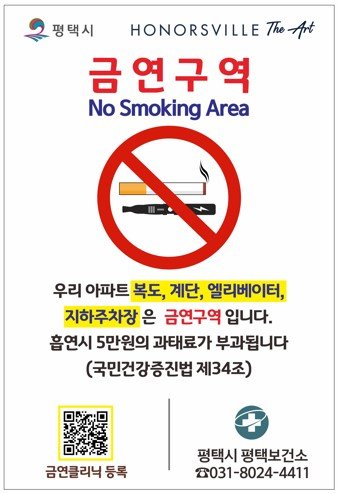평택보건소는 금연아파트 지정 현판 설치와 현수막 게시, 홍보물 배포를 통해 주민들이 금연 환경 조성에 동참할 수 있도록 지원하고 있다.